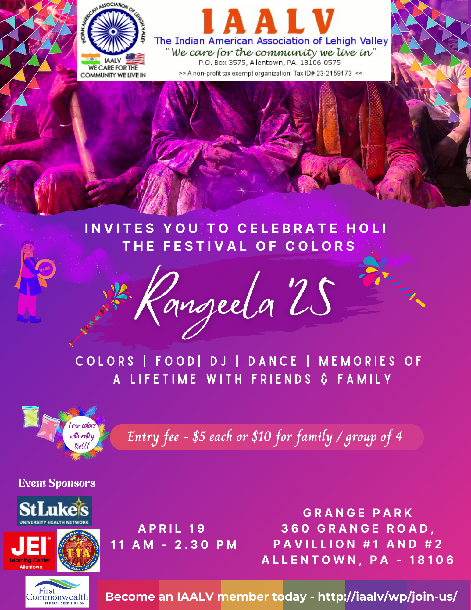 It’s time for Lehigh Valley’s favorite spring outdoor event. Let’s immerse in the festivities of colors that bring joy around the valley. “Holi”, a celebration of the end of winter and the beginning of spring. The celebration of IAALV Holi in the Lehigh Valley originated in year 2016 with increased participation and success every year. An absolute favorite event among kids too! Come, experience the fun and frolic yourself. Bring along friends and family too. See you soon!!