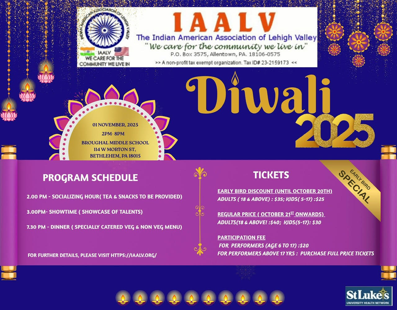 Broughal Middle School - Bethlehem 114 W Morton St, BethlehemCelebrate Diwali with the IAALV Family! ✨ The Indian American Association of Lehigh Valley (IAALV) warmly invites you to join us for IAALV Diwali 2025, a vibrant evening of light, culture, and community. Come together with family, friends, and neighbors to celebrate the Festival of Lights with captivating performances, delicious food, and joyful festivities that